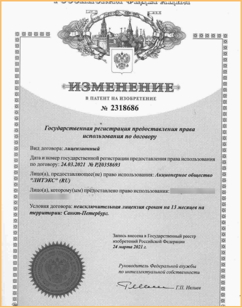 АО «ЛИТЭКС» является патентообладателем и передаёт заинтересованным лицам неисключительное право на использование изобретения. Лицензиатом может стать юридическое лицо – АО, ООО, ИП